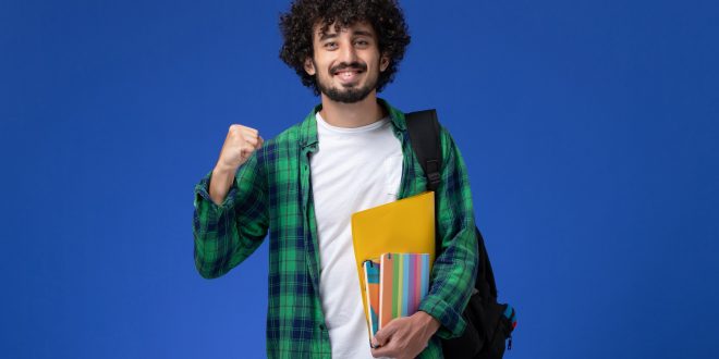 front view male student wearing black backpack holding copybooks and files on blue background university college lesson school