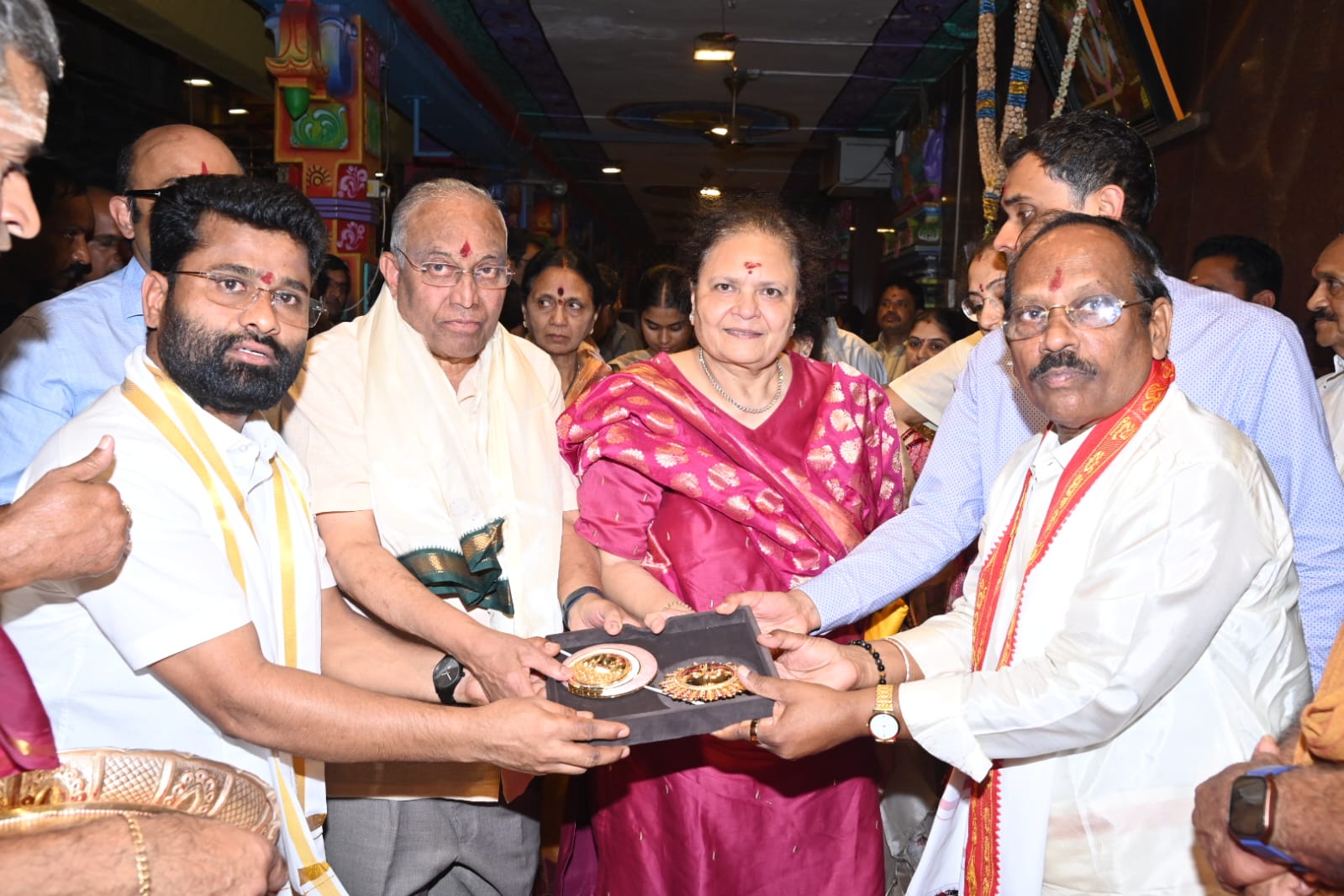 విజయవాడ,ఐఏషియ న్యూస్: విజయవాడ కీలాద్రి శ్రీ కనకదుర్గ అమ్మవారి కి గురువారం రాత్రి 8. 30గంటలకు దేవస్థానంనకు దాతలు విచ్చేసి 531 గ్రాముల విశేష వజ్రాభరణాలు సమర్పించారు.సూర్యుడు, చంద్రుడు, ముక్కు పుడక, బులాకీ,బొట్టు, సూత్రాలు, గొలుసు ఈ ఆభరణాలు బంగారంతో చేయించి, వజ్రాలు పొదిగి తయారు చేశారు. దాతల నుండి ఆభరణాలును ఆలయ చైర్మన్ బొర్రా రాధాకృష్ణ,ఈవో శీనానాయక్ అందుకున్నారు.ఈ కార్యక్రమంలో తమిళనాడు గవర్నర్ సతీమణి శ్రీమతి లక్ష్మిరవి, శ్రీ గోకరాజు గంగరాజు, శ్రీ కనుమూరి బాపిరాజు,శ్రీ సూరజ్ శాంతకుమార్ డైరక్టర్, కీర్తిలాల్ కాళిదాస్ జ్యుయలరీ, తదితరులు పాల్గొన్నారు.
