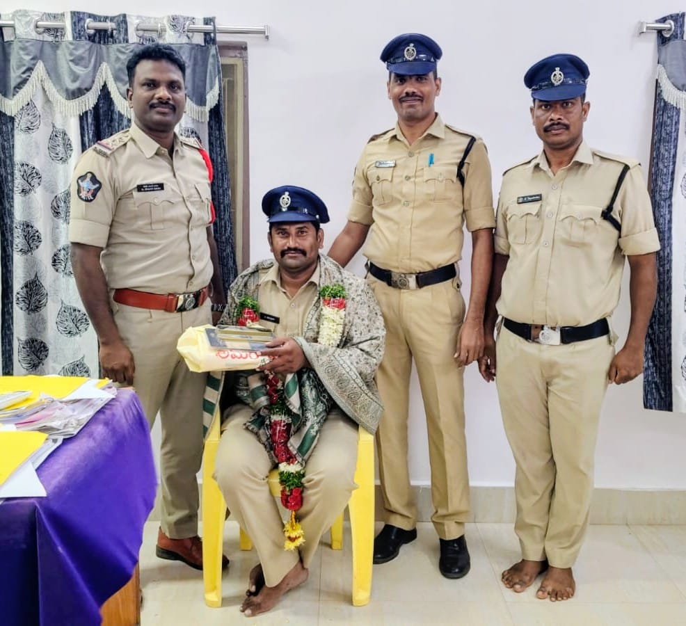 గుడివాడ,ఐఏషియ న్యూస్: విజయనగరం జిల్లాకి చెందిన బంకురు శ్రీహరి గత 5ఏళ్ళుగా కృష్ణా జిల్లా పోలీస్ శాఖలో విధులు నిర్వహిస్తూ ప్రస్తుతం గుడివాడ తాలూకా పోలీస్ స్టేషన్ లో పని చేస్తూ రాష్ట్ర ప్రభుత్వం నిర్వహించిన మెగా డీఎస్సీలో పట్టుదలతో చదువుకుని ఒక వైపు విధులు నిర్వహిస్తూ మరొక వైపు డీఎస్సీ కోసం కస్టపడి చదివి వచ్చిన ఫలితాల్లో ఓపెన్ కేటగిరీలో ఎస్ జి టి పోస్ట్ కు అర్హత సాధించటం జరిగింది. దీనిపై పలువురు ఉన్నతాధికారులు ప్రశంసించారు..మరియు గుడివాడ తాలూకా ఎస్ఐ నంబూరి చంటి బాబు శాలువాతో సత్కరించి శుభాకాంక్షలు తెలియజేసి ఉపాధ్యాయ వృత్తిలో కూడా మంచి పేరు ప్రఖ్యాతలు సాధించాలని మరింత ఉన్నత స్థాయికి వెళ్లేలా కృషి చేయాలని అభినందించి మంగళవారం పోలీస్ శాఖ నుండి రిలీవ్ చేయటం జరిగింది.
